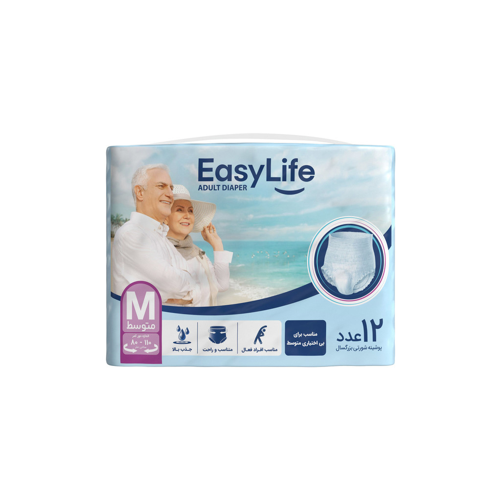پوشينه شورتی بزرگسال ایزی لایف سایز متوسط یک محصول تخصصی، راحت و ایمن برای مراقبت از بزرگسالان است. جذب بالا، طراحی شورت مانند و جنس نرم، استفاده طولانیمدت و راحتی کامل را تضمین میکند.